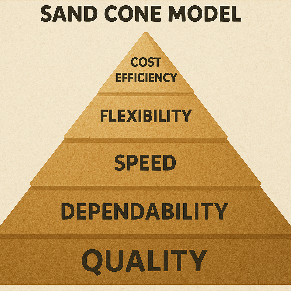 The Sandcone Model (Ferdows & De Meyer, 1990) posits that operational excellence builds cumulatively: first by ensuring quality, then dependability, followed by speed, and only then focusing on cost. Skipping or reversing this order risks undermining long-term competitiveness. It points to the trade-offs between the criteria for evaluating operations (cost, quality, dependability, speed, and flexibility), but argue that the criteria should be built in a specified order: